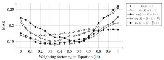 As shown in Figure 8, the hyper-parameter search was conducted for a range w C [ 0 , 1 ] with a step size + 0.05 . The weighting function was tested for five cases that weight uniformly (1), on high ( d + 1 ), low ( D + 1 d ), medium ( D | d D 2 | ), and extreme degrees ( | d D 2 | + 1 ), respectively. The uniform case ( w R ( d ) = 1 ) had the lowest MAE at the most of w C values, among the weighting functions. And, when w C = 0.35 and w R ( d ) = 1 , the W-R/C case had the lowest MAE. This result indicates that character vectors are more effective for representing characters than role vectors, but role vectors also supplement the accuracy of the character representation. Also, every degree of social roles is equally (at least, similarly) important. The extreme case ( w R ( d ) = | d D 2 | + 1 ) exhibited the similar performance with the uniform case. Among the other three cases, the low and medium cases ( w R ( d ) = D + 1 d and = D | d D 2 | ) showed the best and worst performance, respectively. These results could come from that centrality of characters affects human perception for characters more than we expected, since social roles on D = 0 are equal to centrality-based categories (i.e., protagonist, main, minor, and extra characters). Also, high degrees might represent character roles more detailedly than medium degrees. We can apply other types of kernel functions (e.g., Epanechnikov, Quartic, and Gaussian kernels) for adjusting the weighting factors. However, complicated kernels are not realistic, since character networks are far smaller than social networks in the real world and do not require the large maximum degree (D).