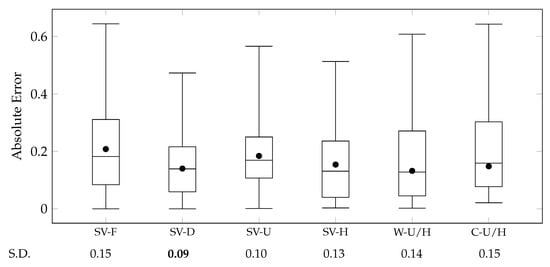 Combinations of Story2Vec-H and Story2Vec-U outperformed cases that the methods were solely used, in terms of the MAE. Nevertheless, the variance of absolute errors was higher in the combinations than in the standalone cases. First, the W-U/H case employs the weighting factor (in Equation (19)) to combine story vectors from the two methods. The optimal w S has been discovered by searching a range of [ 0 , 1 ] with a step of + 0.05 , as displayed in Figure 12b. The W-U/H case exhibited the lowest MAE at w S = 0.70 . Also, from w S = 0.55 to 0.75 , the W-U/H case showed relatively consistent MAE. When w S is close to 0.00, the W-U/H case is as with the SV-H case. Thus, Story2Vec-U had more contributions to the W-U/H case than Story2Vec-H, although Story2Vec-H has a lower MAE than Story2Vec-U. Although the C-U/H case also performed a lower MAE than the SV-H and SV-U cases, the W-U/H case outperformed this case in terms of both the average and variance of absolute errors.