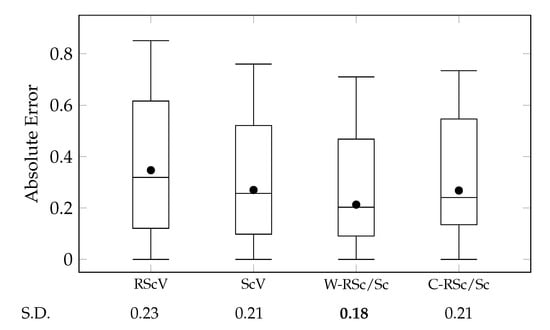where Φ R s α , l and Φ H s α , l indicate scene vectors of s α , l generated by Scene2Role2Vec and Scene2Vec, respectively. We compared the aggregations with the cases that Scene2Vec and Scene2Role2Vec were solely used (ScV and RScV). Figure 11 presents comparisons between these cases by using a box-and-whisker plot for their absolute errors.