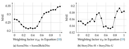 We examined whether aggregating scene vectors generated by Scene2Vec and Scene2Role2Vec outperforms the cases that the methods were used alone (ScV and RScV). The W-RSc/Sc case exhibited the lowest MAE and variance of absolute errors among all the cases. Nevertheless, in terms of the variance, the improvement was not vivid. The W-RSc/Sc case employs the weighting factor w SC in Equation (18) to adjust the influence of the two embedding methods. We searched the optimal w SC in a range [ 0 , 1 ] with a step size + 0.05 , as displayed in Figure 12a. The W-RSc/Sc case exhibited the lowest MAE on w SC = 0.30 . However, the accuracy did not change significantly according to the changes in w SC . Therefore, it is difficult to say which scene embedding method has more contributions to the W-RSc/Sc case. MAE of the C-RSc/Sc case was lower than of the RScV case but slightly higher than of the ScV case. In terms of the variance, the C-RSc/Sc case exhibited a little lower variance than the ScV case. Combining the two methods improved the quality of story vectors. However, the improvement was insignificant.