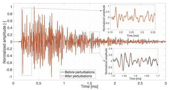 Traditionally, sonic methods or vibration measurements for Structural Health Monitoring (SHM) are performed below 20 kHz; the wavelength is larger than or of the order of the macroscopic size of the structure []. Thus, it has a limitation in detecting the microscopic features and many typical defects. However, when the working frequency range exceeds 50 kHz, the wavelength is in the order of the size of the aggregates, and waves interact strongly with the heterogeneities and propagate along the multiple scattering trajectories, which are longer and much more complicated than the direct wave or simple reflected ones. Coda wave is an accumulation of all scattered, diffuse waves which are highly repeatable. Subtle changes in the medium are amplified by repeated sampling []. Therefore, the coda wave has a higher sensitivity to weak perturbations in the medium. The scientific fundamental of the CWI method is to extract information from two US signals recorded in different states as shown in Figure 1. It is easy to see that the first arrivals of two signals are almost identical; however, a slight waveform variation and time-domain perturbation are observed in the coda wave part (later arrivals).