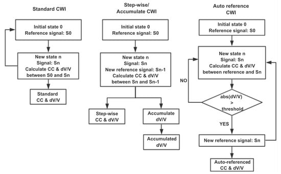 Regularly, the standard CWI method chooses a fixed reference to calculate the CWI properties. Nonetheless, when the changes in the medium reach a certain level, the waveform and/or the time-shift of the US signal in the new state could change substantially. Even though CC can still be useful as it presents the similarity of two signals, the dV/V is not meaningful anymore. In this case, step-wise CWI or auto reference CWI procedures, which changes the reference signal according to different situations, are proposed []. In the step-wise CWI method, a moving reference is used; CC and dV/V are calculated by the current signal and its previous signal. The step-wise dV/V could be accumulated to provide an overall change compared to the first reference signal. However step-wise CC cannot be multiplied as it is non-unique []. Damage such as crack openings might cause a velocity variation of more than 1% []. In this paper, when the absolute value of dV/V exceeds the threshold of 1%, the reference signal will be switched to the current US signal automatically; this is the so-called ‘auto reference’ CWI. This method limits the dV/V variation range to [–1, 1] which gives us a clearer view of velocity change when it is relatively small. The algorithms of these methods are shown in Figure 2.