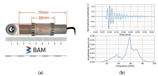The ultrasonic sensor used in these experiments is ‘SO807’ which is a hollow piezoceramic US transducer designed by Acoustic Control Systems, Ltd. exclusively for BAM. It can be easily installed in the structure during the construction before casting [,]. Moreover, a special installation method is developed allowing its installation on existing structures [,]. As the transducer is installed inside the structure, the interior of the structure is better monitored and the influence of near-surface changes is reduced. SO807 can be used as both transmitter and receiver. Figure 3a shows the dimension of SO807 transducer. Two SO807 transducers were placed 40 cm away from each other in parallel in water. A short pulse of 60 kHz excited one transducer and the first arrival received by the other one is shown in Figure 3b. According to the amplitude spectrum, the central frequency peak is around 58 kHz, which leads to the interaction between waves and heterogeneities.