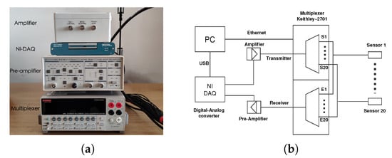 The data acquisition system (Figure 4) allows continuous monitoring with a maximum of twenty US transducers with a sampling frequency of 1 MHz. If necessary, the temperature can be also recorded for long-term monitoring. As the experiments described in this paper were performed in a laboratory environment, the influence of temperature was negligible. Transducer transmitter-receiver pairs can be controlled and configured easily in the control program. All the US data could be synchronised to the specified FTP server automatically, which allows remote measurement. The whole system includes: