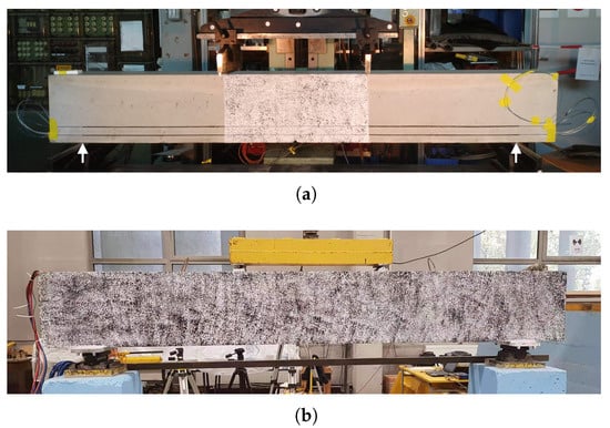 Two similar RC specimens were designed to perform four-point bending tests at BAM and NEOSTRAIN. The dimension of the beams is 290 cm × 20 cm × 40 cm (length × width × height). The beam at BAM (Figure 5a and Figure 6) was reinforced with two 6 rebars in the compression zone and two 14 rebars in the tension zone, attached by six 6 stirrups with a spacing of 30 cm. The beam at NEOSTRAIN (Figure 5b and Figure 7) was reinforced with three 10 rebars in the tension zone and two 10 rebars in the compression zone, attached by thirteen 6 stirrups.