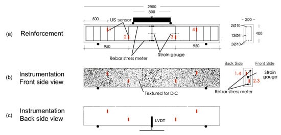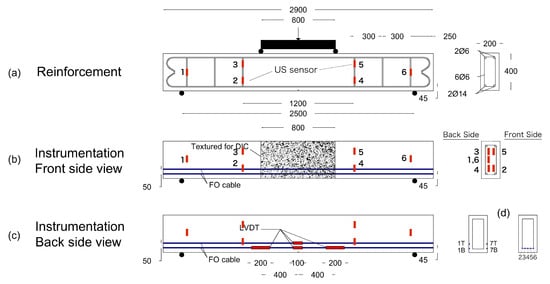 Dimensions of the beam, rebars distribution, and sensors positions at NEOSTRAIN.