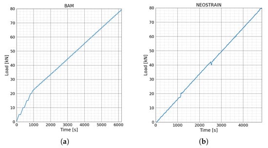 A step-wise loading procedure was performed for the test at BAM due to the low measurement frequency of the interrogator of FOS technique. In total, 64 load steps were performed. The load increased 5 kN/min and remained stable for one minute until 20 kN. For the following steps, the load increases 1 kN/min and remained stable for one more minute until reaching 80 kN as shown in Figure 8a. The loading procedure of the test at NEOSTRAIN was performed continuously with a increasing rate of 1 kN/min. Since the loading procedure at NEOSTRAIN was controlled manually, the load increased unexpectedly from 18 kN to 19.4 kN due to a mistake of the operator (Figure 8b).