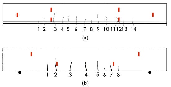- Destrebecq, J.F.; Toussaint, E.; Ferrier, E. Analysis of cracks and deformations in a full scale reinforced concrete beam using a digital image correlation technique. Exp. Mech. 2011, 51, 879–890. [Google Scholar] [CrossRef]