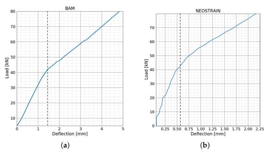 Load-deflection curve for bending test at (a) BAM and at (b) NEOSTRAIN.