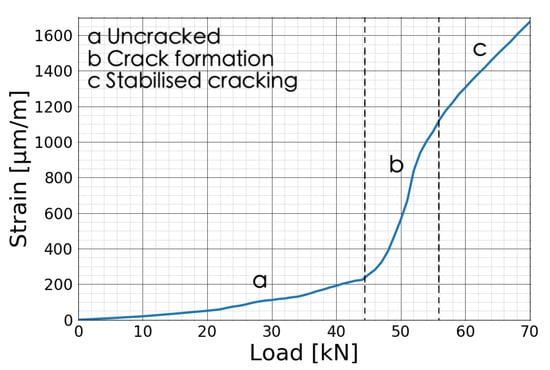 The stress-strain relationship can distinguish between different stages of the crack opening: the uncracked stage, the crack formation stage and the stabilised cracking phase []. Figure 11 shows the three different stages of crack number 5 in the beam at BAM measured by fiber line 7 on the bottom in the front. The measured area remained uncracked until 45 kN, then the crack started to form and went into the stabilised cracking phase at 56 kN.