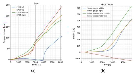 (a) Displacements measured by LVDT sensors at BAM. (b) Strain variation inside concrete and rebars measured by strain gauges and rebar stress meters at NEOSTRAIN.