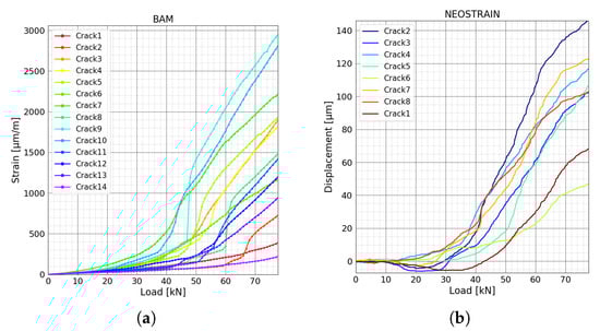 (a) Strain variation at position of all cracks measured by fiber line 7B at BAM. (b) Displacement at position of all cracks measured by DIC technique at NEOSTRAIN.