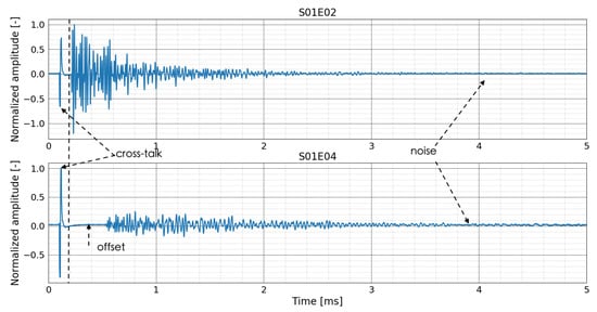 As an example, signals measured by transducer combinations and (: transmitter xx and receiver yy during the initial stage of the beam at NEOSTRAIN are plotted in Figure 14. The signals need to be pre-processed to filter the noise and to remove offset and cross-talk (more details can be found in []). As the distance between transducer number 1 and 4 is longer than that of transducer number 1 and 2, the signal received by transducer combination has a longer time of flight and lower amplitude due to the attenuation of US wave in concrete.
