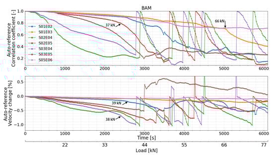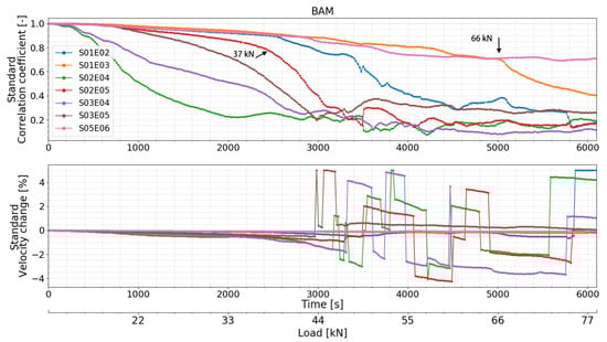 Correlation coefficient and relative velocity change of all the transducers combinations in test at BAM.