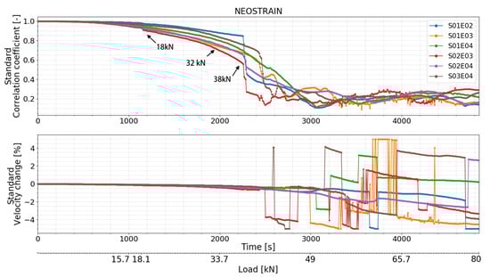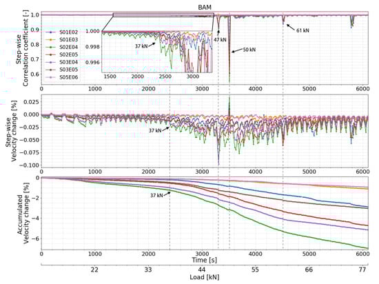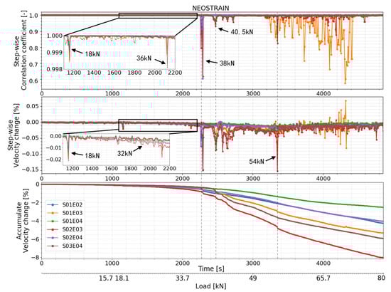 As shown in Figure 18, Figure 19 and Figure 20, small variations in CC and dV/V were observed at 18 kN which corresponded to the misoperation mentioned in the ‘loading procedure’ section. Both features of all transducer combinations then decreased smoothly. CC and dV/V of transducer combination decreased with a higher rate at 32 kN. A small change was detected by transducer combinations , , and at 36 kN by step-wise CWI method. A second strong change can be seen in the CC and dV/V of transducer combinations , , and at 38 kN. CC and dV/V of all transducer combinations related to transducer number 3 (, , and ) started to change irregularly from 40.5 kN, meaning that the multiple cracks occurred near transducer number 3. This is close to the moment when the beam entered plastic phase. CC and dV/V measured by the top level transducer combination had their first sudden change at 54 kN. This means either cracks affected the direct path between them or the global damage in the beam reached a certain level.