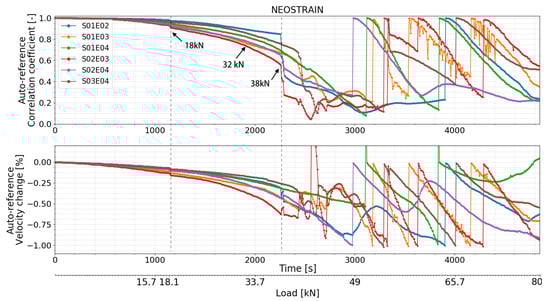 Correlation coefficient and relative velocity change of all the transducers combinations in test at NEOSTRAIN calculated by auto reference CWI.