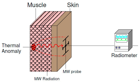 Medical Microwave Radiometry (MMR) is a low-cost, non-ionizing, non-invasive procedure for medical diagnosis. This passive method is based on the measurement of the internal thermal electromagnetic (EM) radiation of a body region, and its detection using a radiometer system (Figure 1). Hence, the analysis of any anomalous temperature variation measured using these systems could help in the assessment of a medical complication or pathology. Indeed, MMR has already been applied to cancer detection [1], cancer treatment [2], hyperthermia temperature control [3], human core temperature tracking [4], atherosclerosis in the human carotid [5] and the diagnosis of arterial disease in diabetic patients [6]. In all these applications, the MMR system has to be able to detect temperature variations of less than 1 K, and thus, very small changes in the received power. Therefore, an antenna able to measure the EM radiation in an efficient way is required. Hence, it demands a good coupling between the MMR probe and the area under test. In addition, a good matching is also compulsory, which depends on the specific body region and on the patient’s complexion, since an adipose layer close to the skin could significantly modify the permittivity of the intended tissue. This is mainly due to the substantially lower value of the relative permittivity of fat tissue compared to skin or muscle.