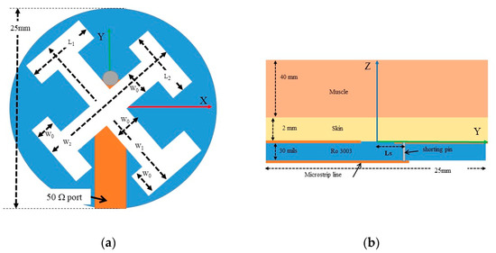 The antenna must be matched to a human neck [5] or foot [6], which are body areas without an adipose layer. Therefore, a two-layer structure was chosen to model these body volumes. The antenna was in contact with a 2-mm thick skin layer. The second layer (muscle) was modeled as a large enough volume to be considered semi-infinite (Figure 2b). Then, a 40-mm thickness was considered. Since the dielectric properties of the tissues change with frequency, according Table 2 [17], several simulations were carried out using these parameters. The antenna was designed on a Rogers3003TM flexible substrate, with relative permittivity , loss tangent at 10 GHz, and a thickness of . The design parameters of the antenna were optimized with HFSS [17] and are shown in Table 1. The set of parameters and control the resonant frequencies of each slot, in agreement with Equation (1), while the parameters and adjust the matching between the antenna and the body region. In the simulations, a frequency-dependent Debye model was used, with the dielectric properties given in Table 2.