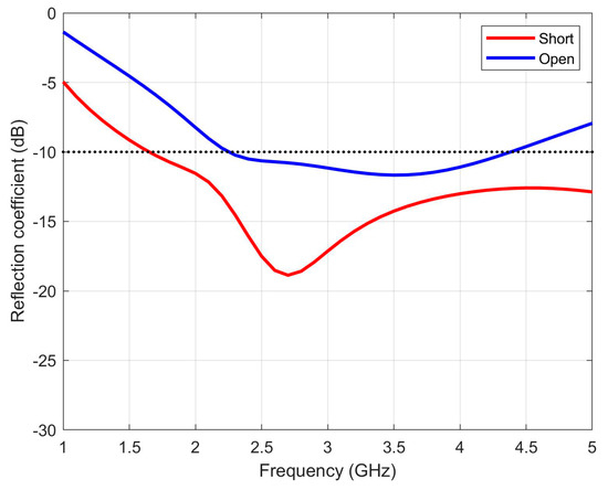 In order to show the better performance of a short-circuited stub versus an open-ended version, the input reflection coefficients of the antenna, using both configurations, are compared in Figure 3. The parameter was fitted to the maximum value for the open stub configuration, that is, Ls = 12 mm. The short-circuited antenna shows a good matching from 1.5 GHz up to more than 5 GHz. This result is much better than the open stub design. To improve the matching for the open-circuited antenna, the surface of the antenna has to be enlarged, reducing its potential use as an epidermal antenna.