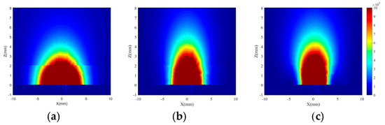 In Figure 4, volume power losses for different frequencies inside the proposed phantom model tissues (Figure 2b) are shown in plane Y = 0. In all frequencies, the antenna is fed by a power of 1 W. Although the propagation losses inside the tissue increase with frequency, the E-field remains approximately constant. This is because the electrical size of the antenna also increases with the frequency, and thus the antenna directivity. Similar results were found for the plane X = 0.