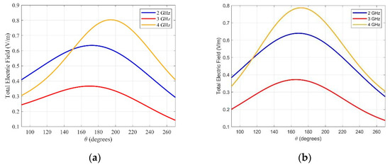Back radiation electric field of the asymmetric Jerusalem cross antenna for (a) and (b) at different frequencies.