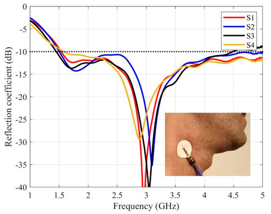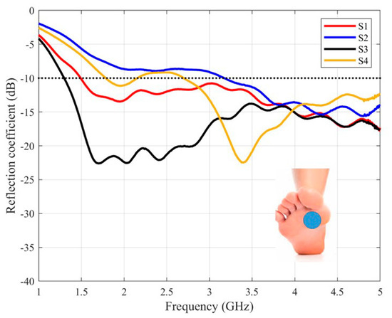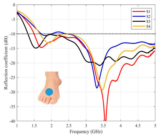In Figure 8, results for the instep are shown. In this case, the antenna is also matched in three cases, from 1.8 GHz, while for the S2 volunteer, the antenna is slightly mismatched around 2.2 GHz.