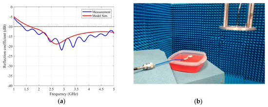 In order to show the back radiation level of the designed antenna, an ex profeso measurement set-up has been developed. The antenna under test was placed on a mimic gel made with MSL900V2 solution [20] with εr = 46.50 and σ = 2.28 S/m at 2 GHz, agar-agar as a gelling agent, and red colorant. The antenna is matched between 1.5 and 5 GHz (Figure 10a). The measured reflection coefficient is very similar to the simulated one, using the proposed model. The antenna on the gel was positioned in an anechoic planar range facility (Figure 10b), and a vector network analyzer was used to measure the transmission coefficient between the antenna under test and the probe antenna.