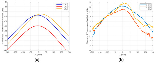 Normalized transmission coefficient for the back radiation of the Jerusalem cross slot antenna. (a) Simulations. (b) Measurements.