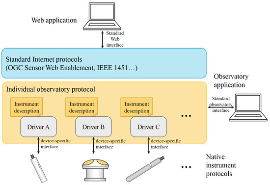In traditional design, each instrument interface of an ocean observatory is customized depending on the connected instrument. This solution is acceptable for small-scale observatories with just a few fixed instruments. However, large-scale observatories need a flexible scheme to integrate new instruments and to facilitate interoperation within the observatory system, i.e., to communicate and exchange data among instruments. The key to achieving this is interface standardization, i.e., to unify the hardware and software interfaces of ocean instruments in the system. Since there is no common standard for ocean instruments, the current solution is adding a protocol layer to the system architecture of an ocean observatory [5], as shown in Figure 2. Drivers are customized for each instrument type to translate between native instrument protocols and individual observatory protocol with description files [6]. In this way, every nonstandard instrument is standardized on the individual observatory protocol layer by mapping between the two protocols. IEEE 1451 and Open Geospatial Consortium—Sensor Web Enablement (OGC-SWE) have been adopted to facilitate ocean instrument interoperation [7,8,9]. IEEE 1451 defines a set of open, network-independent communication interfaces [10], but it is complicated and lacks flexibility. OGC-SWE defines an open standard framework to exploit sensors or instruments via the internet for worldwide data exchange [11], but it is also very complicated and unsuitable for resource-constrained underwater scenarios.