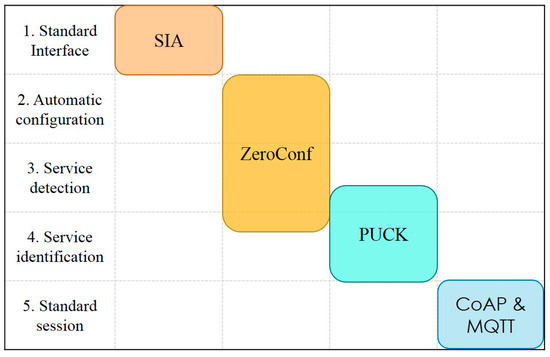The protocols and standards used in our scheme are shown in Figure 3; the SIA firmware, as well as the Zero Configuration Networking (Zeroconf), PUCK, CoAP, and MQTT protocols, are adopted to meet the designed requirements.