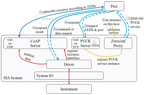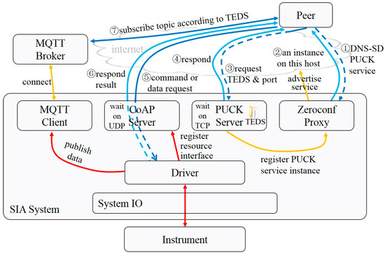 Once powered up, the SIA first initializes all universal modules and registers TEDS to the PUCK module. The PUCK server starts listening on the TCP port and registers the service instance to the Zeroconf proxy module. Then, the Zeroconf proxy advertises the service instance and listens over mDNS. In the meantime, the CoAP server starts listening on the UDP port, and the port number is registered to the PUCK module. If an MQTT broker is available, the MQTT client module will figure out the address of the MQTT broker and connect with it, waiting for publishing data for the driver.