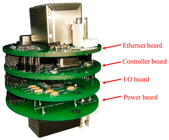 As Figure 8 shows, the printed circuit board of the SIA is designed as a multi-layer stacked structure, including an Ethernet board, a controller board, an I/O board, and a power board. The Ethernet board contains network chips and electronic interfaces. The chip WIZnet W5500 is used to provide a hardware TCP/IP protocol stack. The controller board contains a microcontroller, a storage chip, and a clock chip. The microcontroller is NXP MC9S12 which provides abundant standard on-chip peripherals [27]. The I/O board contains chips and interfaces for interacting with instruments, supporting serial communication interface EIA-232 and EIA-485, as well as an analog to digital conversion function. The power board steps down the input voltage to power the SIA and the instrument with a suitable DC–DC converter.