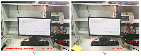 To verify the interoperable capability of the scheme, two SIAs and one PC are used in our laboratory test, as Figure 10 shows. For demonstration purposes, SIAs are encased in 3D-printed resin housings, which will be manufactured by stainless steel or titanium alloy before being deployed in the ocean environment. The SIAs and the PC are interconnected through a network switch with no DHCP server. An MQTT broker starts up on the PC and registers an “_mqtt._tcp” service instance.