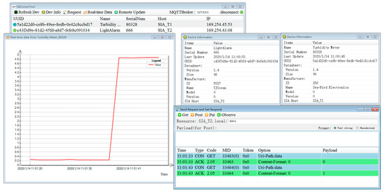 The SIA A is connected with the turbidity instrument. After initialization, the driver searches for the MQTT service instance through the DNS-SD and connects to the MQTT broker on the PC. Then it samples the analog output from the instrument and publishes the voltage data to the MQTT broker periodically. The data is also registered to the CoAP server.