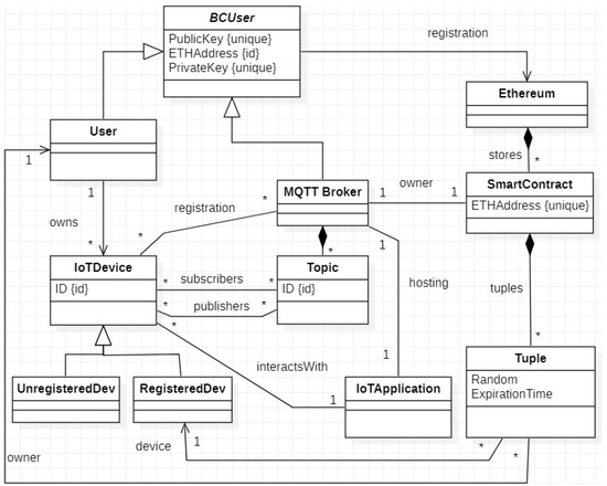 The main class of this model is IoTApplication, which represents a generic application in the IoT domain. Each IoT application is hosted by an MQTT broker and interacts with a set of IoT devices. Hence the corresponding class in the domain model is associated with the classes MQTTBroker and IoTDevice. The former models the concept of an MQTT Broker while the latter models whatever IoT device is involved in the functionalities offered by the IoT application. Each IoTDevice is identified by an ID (note that from now on, we consider the IPv6 address of the device as its identifier). The IoTDevice is connected to the class Topic with two different associations, which model the roles of publishers and subscribers they can play. As we will describe, the devices must be registered at the MQTT broker. Hence, the class IoTDevice is derived in two different classes in the domain model, i.e., UnregisteredDev and RegisteredDev. On the other hand, each device is owned by a User. The class User is generalized in the class BCUser, which represents a generic Ethereum user. It is characterized by an Ethereum address (identifier of the class) and a couple of keys (public and secret). In our approach, both a physical User and the MQTT Broker are possible users of the Ethereum blockchain; in fact, they inherit from the class BCUser. On the right of the model, we reported the concept of the Ethereum blockchain, represented by the homonym class, which stores a set of SmartContracts. Each Smart Contract has an Ethereum address and, for our solution, contains a set of tuples—one for each device.