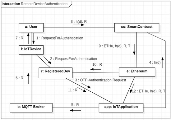 We start from the description of the authentication procedure of a remote device. In this case, the user, in order to authenticate the owned remote IoT device, needs an auxiliary local IoT device (not necessarily registered to the MQTT broker) which is able to communicate with the remote device and with the broker. The UML communication diagram in Figure 4 describes the sequence of messages needed to authenticate the remote IoT device acting as publisher. The process starts by the user u which contacts, through her/his local device (namely l), the remote device (namely r) with IPv6 address d (Messages 1–2) asking it to perform the procedure of authentication. When r receives the request of u, it contacts the IoT Application running on the broker (Message 3). This latter extracts a random R from a strong True Random Number Generator (TRNG) and calls a function of the smart contract by sending a transaction from its Ethereum address towards the smart contract, which has the Ethereum address (Message 4), which contains as function parameter. By executing this function, the entry changes to where represents the OTP generation time. From the other side, the value R representing the OTP is sent to the broker and shown to the user by l (Messages 5–6–7). The user reads R on her/his device and calls a different function of the smart contract by sending a transaction from her/his Ethereum address (Message 8), which contains the couple , as function parameters. This function retrieves the entry from the smart contract storage, verifies the temporal validity of the OTP by evaluating the difference between the current time and , and updates the entry by adding the value R if the OTP is not expired. Hence, the final form of the entry is , where T represents the current time. Please note that the delay introduced by the mining of the transactions on the block chain does not impact the validity of our solution. In fact, after Message 8 the smart contract stores the timestamp of the method invocation that is not affected by the following mining time. Hence, the temporal validity considered by the smart contract is related to the net interval of time between Messages 4 and 8 and it is not affected by mining delays.