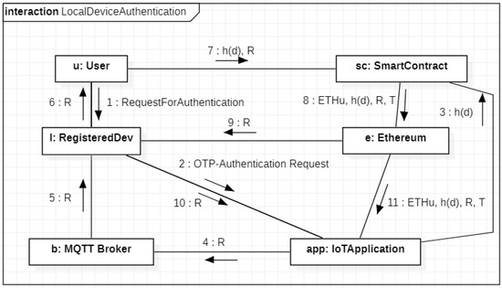The authentication of a local device is simpler than the previous since the process includes a single device. Figure 5 depicts the UML communication describing this process. Initially, the user u contacts his/her local device l (with IPv6 address d) to start the authentication procedure (Message 1). In turn, l contacts the IoT application (Message 2). This latter extracts a random R from a TRNG and calls a function of the smart contract by sending a transaction from its Ethereum address towards the smart contract, which has the Ethereum address (Message 3), which contains as function parameter. By executing this function, the entry changes to where represents the OTP generation time. From the other side, the value R representing the OTP is sent to the broker and shown to the user by l (Messages 4–5–6). The user reads R on her/his device and calls a different function of the smart contract by sending a transaction from her/his Ethereum address (Message 7), which contains the couple , as function parameters. This function retrieves the entry from the smart contract storage, verifies the temporal validity of the OTP by evaluating the difference between the current time and , and updates the entry by adding the value R if the OTP is not expired. Hence, the final form of the entry is , where T represents the current time. Consequently, the smart contract publishes an event on the Ethereum blockchain containing the entire entry (Message 8). Finally. the local device l recovers the OTP R from the list of Ethereum events, and sends it to the IoT application (Messages 9–10). The latter verifies the correctness of R and accesses to the Ethereum event list retrying the public entire entry (Message 11). In particular, the IoT application verifies that R is still valid, and represents the proper user under authentication and checks the freshness of the timestamp T.