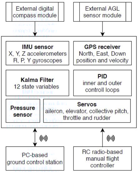 Remote sensing refers to the process of detecting and monitoring the physical characteristics of an area by measuring reflected and emitted radiation at a certain distance from the targeted area. In general, remote sensing applies to all measurements that are conducted remotely. Remote sensing methods are divided into active and passive, whereby active remote sensing describes when a signal is sent from the sensor and is reflected back from the object to be received and analyzed, whereas passive remote sensing methods are based on the analysis of signals emitted by the observed object [1,2]. Satellites and manned aircrafts that are used to collect data remotely are effective but relatively expensive, and these technologies tend to have low spatial and temporal resolutions. They also tend not to be flexible enough to accommodate the needs of many organizations working with these applications [3,4]. To overcome these limitations, unmanned aerial vehicle (UAV) technologies have been developed for remote sensing applications. The main advantage of UAVs is that they can be used in high-risk situations without endangering human life. UAVs can also be utilized in inaccessible areas, at low altitude, and at flight profiles close to the objects where manned systems cannot be flown [5]. In particular, unmanned helicopters have been investigated for several decades [6,7], with the rapid development of this type of flying object now being observed [8,9]. This paper describes the integration process of adapting an autonomous helicopter to perform data gathering in a remote manner. Such tasks require precise flights, for example, through predefined waypoints, while maintaining a given flight speed and altitude. So-called stable flights are especially important when a platform is flying very close to the ground, i.e., 2−3 meters high. In many cases, some additional above-ground level (AGL) sensors are required to provide accurate distance to ground in autopilot [10,11].