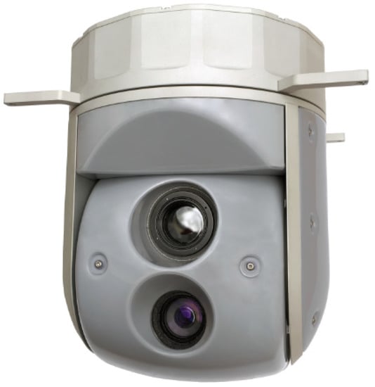 WABIK is capable of carrying an 8” optoelectronic head equipped with a thermal imaging camera and a daylight camera, as shown in Figure 5. It allows remote detection, recognition, and identification and is equipped with a CCD day camera and a longwave infrared thermal camera with radiometry. Target tracking, geo-pointing, an 18x optical continuous zoom, radiometry and isotherm functionality, robust stabilization, and an integrated INS/GPS allow this system to be used in a wide range of military and industrial applications [18,19].