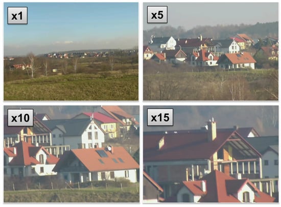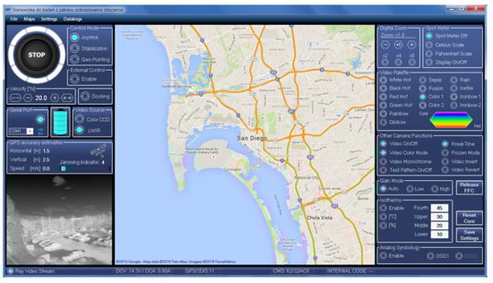 Examples of WABIK’s remote detection capability (500 m away from the target) using a daylight camera with a 15x optical zoom are presented in Figure 6. Full functionality of the developed optoelectronic head was made available to the operator through software installed at the ground flight control station, the interface of which is shown in Figure 7.