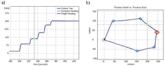 (a) Current and desired heading. (b) Predefined waypoints and achieved flight path.