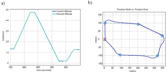 At this stage of tests, only one internal loop was left to tune, i.e., the altitude loop responsible for controlling the throttle in response to the Z velocity. This loop was adjusted in the same manner as the previous loops. The desired altitude was set either by the RC transmitter stick or the ground control station. The response of the helicopter altitude was observed and analyzed at the ground control station and the PID terms were adjusted in the real time. The final results of the achieved altitude loop performance are shown in Figure 10a. The error between the current and desired altitudes did not exceed 0.2 m RMS.