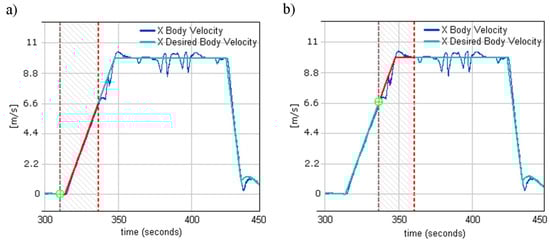 (a) X body velocity while approaching the 1st waypoint. (b) X body velocity while approaching the 2nd waypoint.
