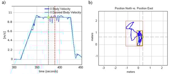 As seen in Figure 11a, the first part of the chart corresponding to flying from takeoff waypoints (point 0,0 in Figure 10b) to the first waypoint (point 0,100 in Figure 10b) was marked. During this part of the trajectory, two loops (X and Y body velocity control loops) were responsible for accelerating the helicopter from 0 to the given 10 m/s. Once 6.6 m/s was reached, small speed disturbances were visible as the helicopter entered the first turn. Similar speed disturbances were seen while the helicopter approached the second waypoint (Figure 11b). At this part of trajectory, the desired flight speed was accomplished. The worst speed disturbances were observed when the helicopter approached a tight turn (point 350, −25 in Figure 10b) flying at 10 m/s, followed quickly by the next tight turn. This case is illustrated in Figure 11a.