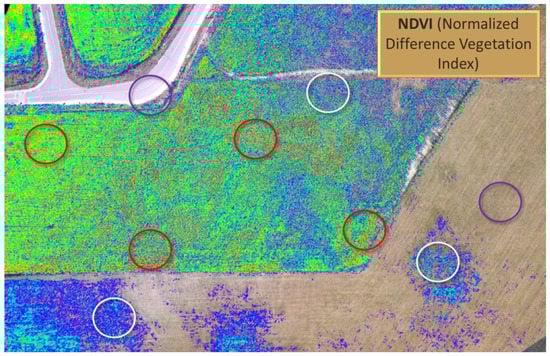 Figure 14 shows red circles, indicating corn field areas in worse condition, and white circles, indicating crops in very poor condition. Objects that are not plants are indicated blue circles. Therefore, NDVI is a simple way to measure general plant health.