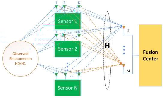 This paper considers a massive MIMO-based distributed detection in multi-antenna wireless sensor networks, as shown in Figure 1, over a “virtual” multiple-input multiple-output (MIMO) channel between N multi-antenna sensors (K antennas per sensor) and FC configured with M antennas. The sensors will perceive observations of information within their coverage. The local decision on the presence of a signal is sent to the fusion center for global judgment. This scenario can be modeled as a distributed binary hypothesis testing problem [], where  and  indicate the presence and absence of the signal , respectively. The sensor measurement model under the two hypotheses is []