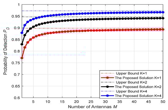Before solving the optimization problem in Equation (21), we analyze the upper bound of the detection probability  as follows