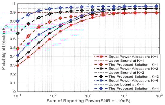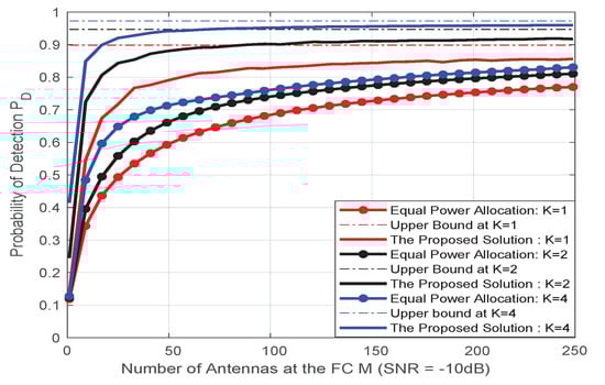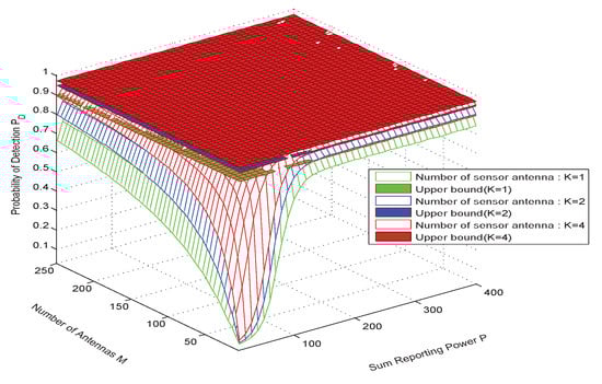 In Figure 4, the effect of the number of antennas of the multi-antenna sensor, the number of fusion center antennas and the total reported power on the detection performance are more clearly shown in the multi-antenna sensor network. The simulation results show that the use of multi-antenna sensors will bring better detection performance. We can see from the simulation results that as the number of FC antennas increases, when M reaches a certain antenna number (such as 200-250), the detection performance of the proposed solution is very close to the performance ceiling. According to our analysis combined with Equation (22), with the increase of the number of antennas in the fusion center, the reception capability of the fusion center will be stronger, and the detection capability to overcome fading in the transmission channel will be greatly improved, but when it reaches a certain level, the detection performance depends on other factors of the receiver noise, i.e., the certain antenna M is dependent on the number of sensor antennas and other variables(e.g., , ). In addition, with the infinite increase of the number of fusion center antennas or the unlimited power constraints, the detection performance of the system will reach the upper limit. As deduced from Equation (22), if the number of antennas and power at the FC are infinite, it is not required for power optimization, but in practice, the number of antennas cannot be too large and the power is limited. Therefore, it is important to consider optimizing power. This also gives us a thought that in the use of multi-antenna sensors, in order to obtain good detection performance, we find a trade-off relationship between the number of antennas M and the reported total power of P. In other words, we can use more antennas at limited power to compensate for the loss performance and vice versa.