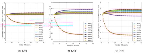 Due to the large number of iterations of the algorithm, we must care about the convergence of the Algorithm 1. The timeliness of Algorithm 1 is important for cooperative perception, especially some disaster detection and danger information detection scenarios. There are many results discussed in the literature [] (see Section 3). The convergence of our algorithm is guaranteed under diverse parameters. We will not reproduce the convergence analysis here and we present simulation results to show the convergence performance of Algorithm 1 in Figure 7.