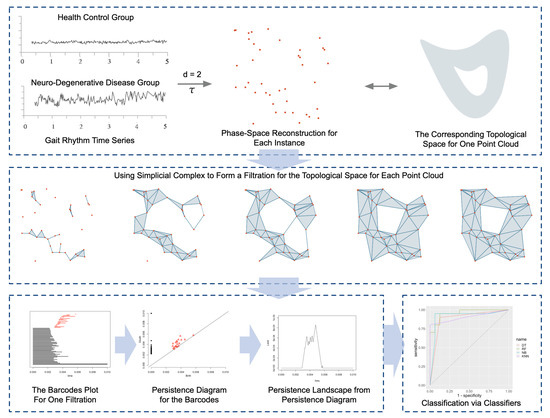 Exploring features from the gait rhythm dynamics and used for disease state recognition is an essential topic in physiological signal analysis. Recently, a powerful tool based on algebra topology theory was proposed for data analysis, which is termed topological data analysis (TDA). TDA techniques have become a useful representation extraction tool for complex data analysis and visualization [12,13,14,15,16,17]. The motivation of TDA comes from the fact that there are discrepancies in geometrical and topological information in an abstract space formed by the data point clouds. In 3-D object recognition tasks, the point clouds lie on the surface of the objects, and TDA-based Mapper framework contributes to the recognition tasks [18]. Later in diabetes research, TDA techniques were successfully used in identify a type-2 diabetes subgroup through patient similarity analysis [19]. Also, TDA contributes to bimolecular data analysis, namely multidimensional persistence for protein folding analysis [20]. In [21], the multivariate data analysis of cultural heritage was studied. Among these works, studying the data with TDA tools delivers novel insights to compare to the traditional tools.